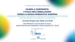 Si svolgerà a Roma, il prossimo 29 gennaio, dalle 10.30 alle 13.00, presso la Sala dell’Istituto di Santa Maria In Aquiro, Senato della Repubblica l’evento “Filiera a confronto: l’Italia dell’imballaggio verso la nuova normativa europea”. Inizialmente in programma lo scorso 13 novembre, l’appuntamento è slittato al nuovo anno per sopraggiunti impegni istituzionali del senatore Gianluca Cantalamessa, promotore dell’iniziativa insieme a Giflex.